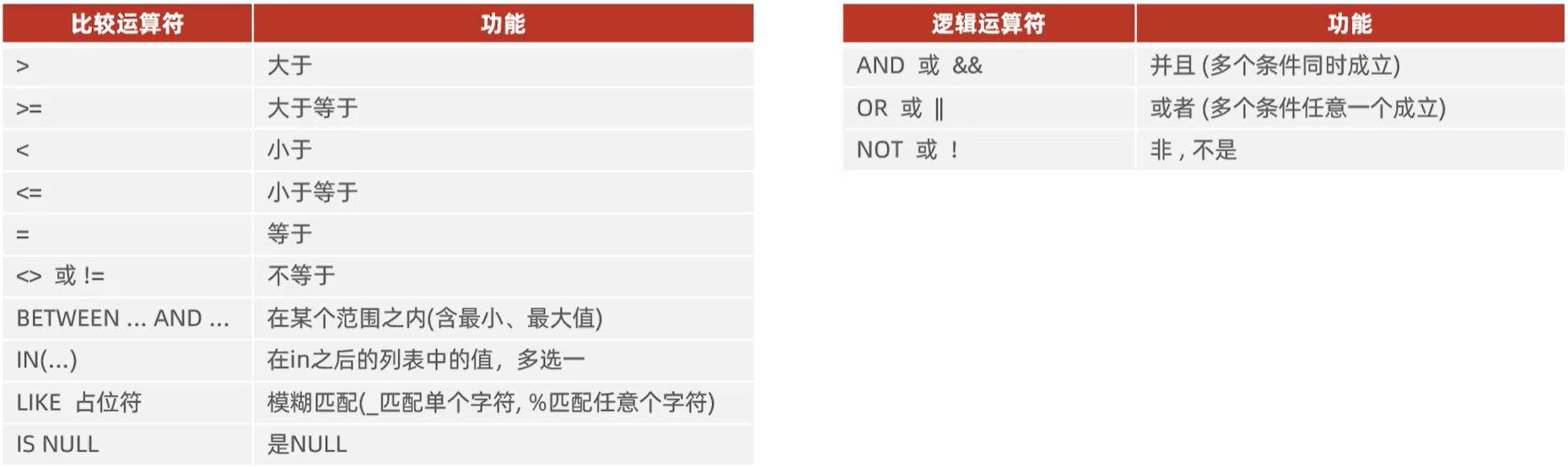 SELECT 字段列表 FROM 表名 WHERE 条件列表;条件