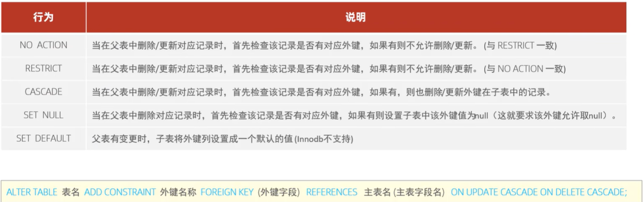 alter table 表名 drop foreign key 外键名称;删除/更新行为