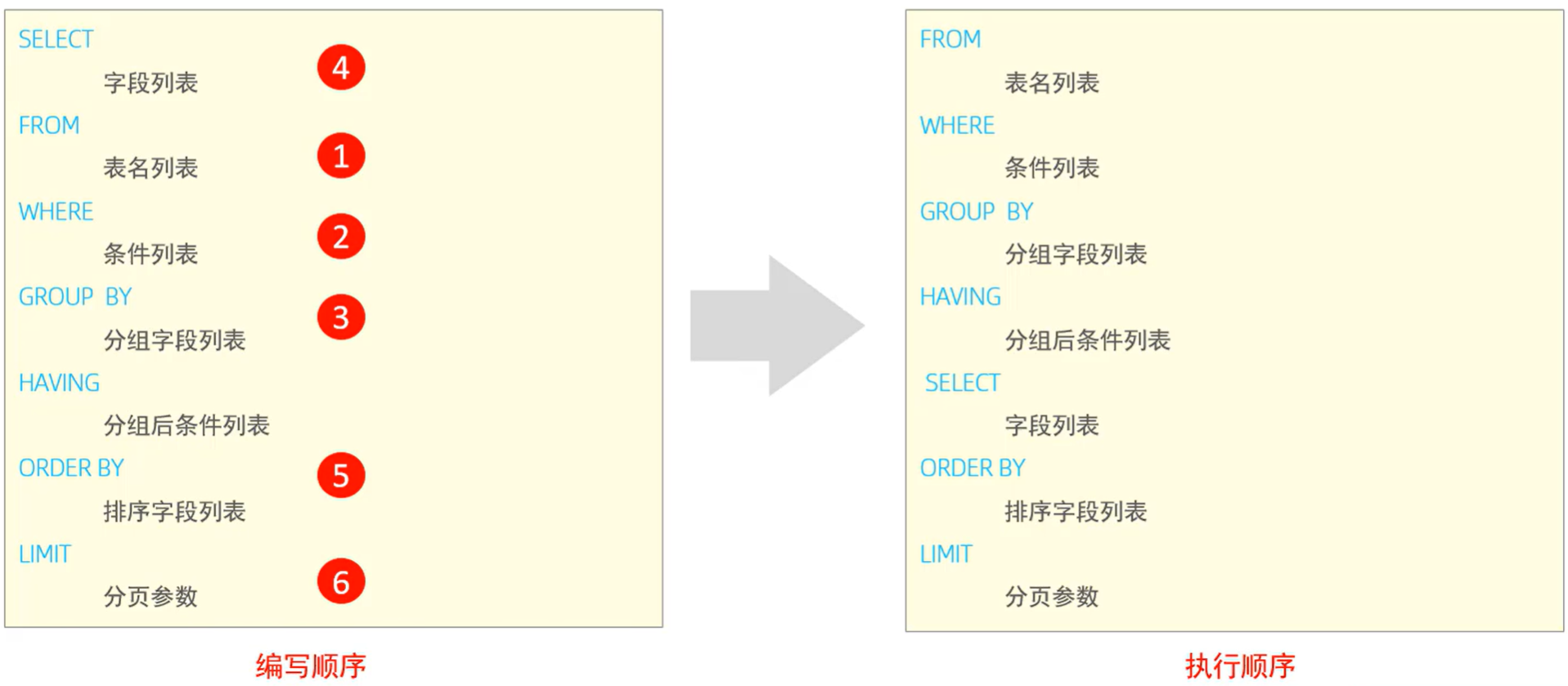 SELECT 字段列表 FROM 表名列表 WHERE 条件列表 GROUP BY 分组字段列表 HAVING 分组后条件列表 ORDER BY 排序字段列表 LIMIT 分页列表